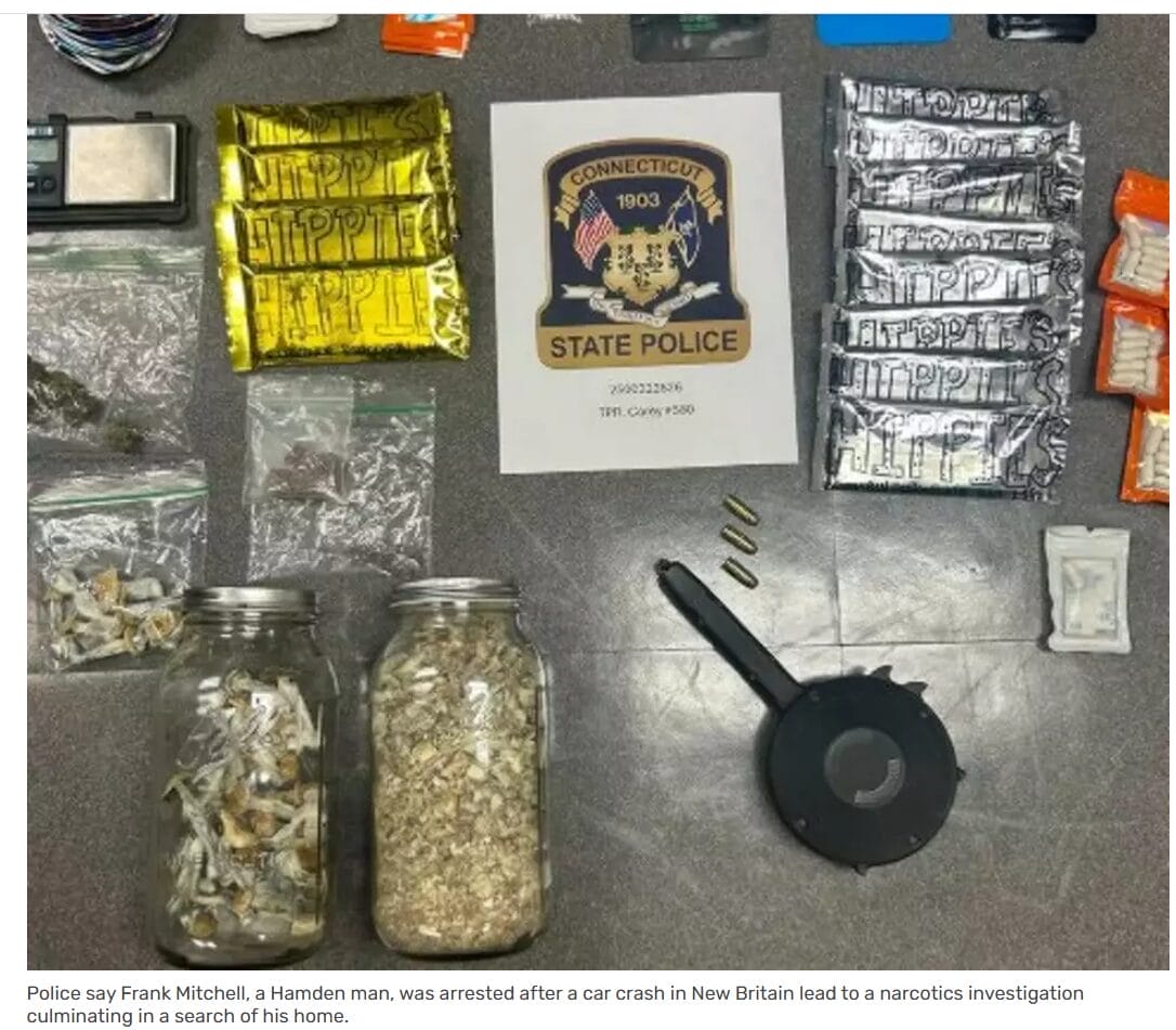 “State troopers discovered substantial drugs, packaging tools, and drug manufacturing paraphernalia in the vehicle and confirmed the individual was producing chocolate bars and gummies laced with hallucinogenic mushrooms. A subsequent search of the suspect’s Hamden residence uncovered additional narcotics, packaging equipment, and an illegal high-capacity magazine. The individual now faces charges for operating a drug factory, possession with intent, drug paraphernalia, and more.” Read about it here: https://www.wfsb.com/2025/06/19/crash-leads-mans-arrest-operating-drug-factory/